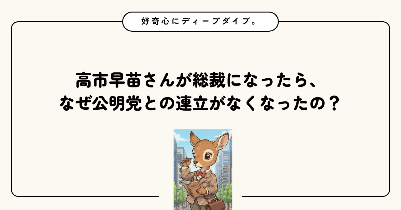 高市早苗さんが自民党の総裁に就任すると、公明党との連立がなくなったという報道を見て、(政治に詳しくないので)理解できなかったので、背景をディープリサーチしてみた。また、諸外国での報道も気になった。